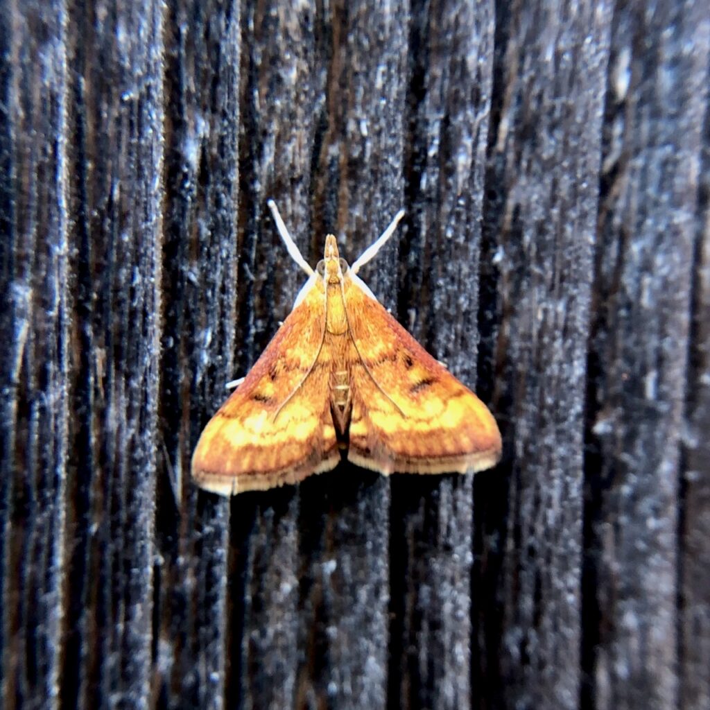 Internet searches attribute the name to the moths’ attraction to light, but I’m not convinced that’s the connection. Pyrausta moths come in varying shades of orange, red, or pink. Could their fiery colors have inspired the name?