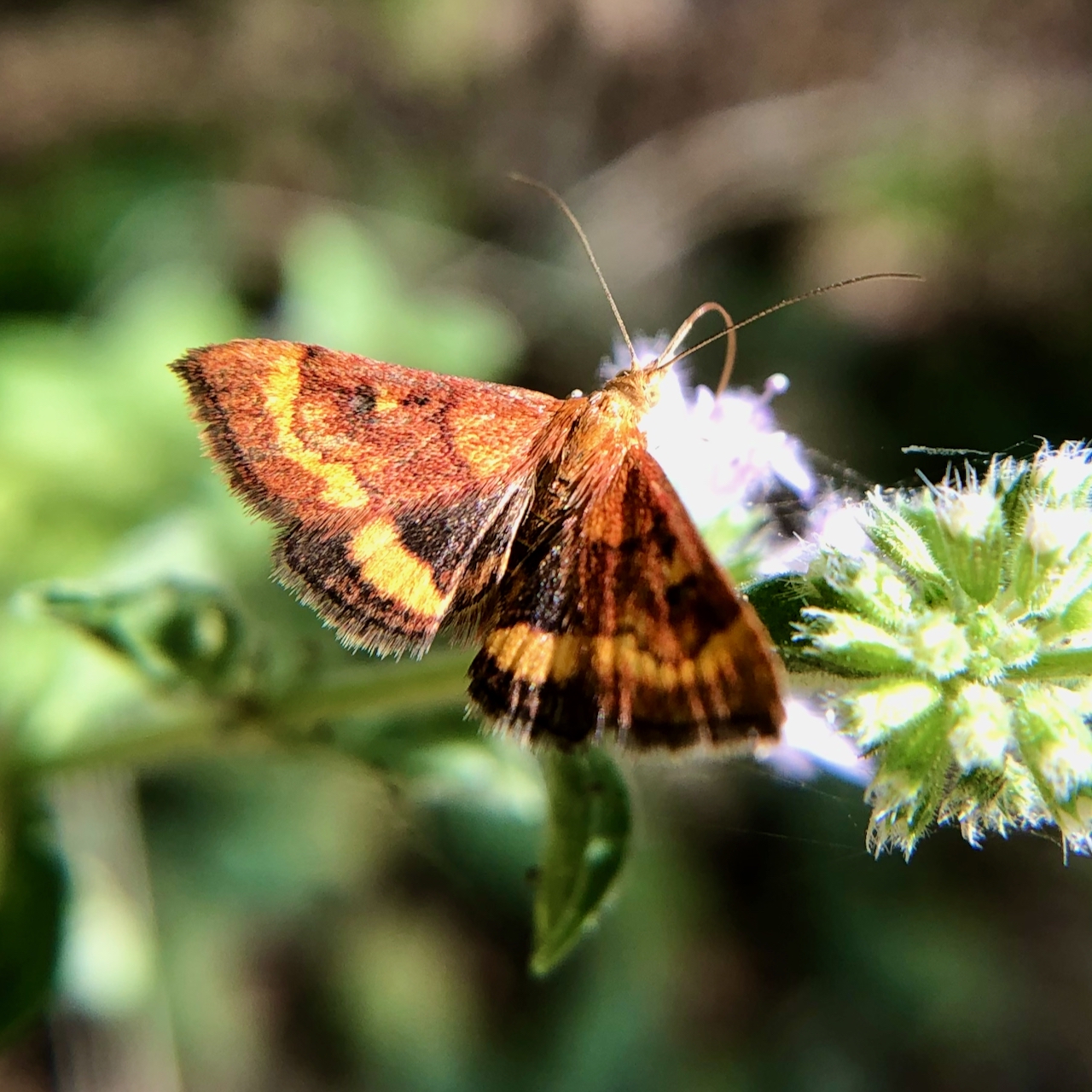 Most of the Mint Moths I’ve seen at Mount Pisgah are orange, with varying amounts and patterns of black. But, there are bright pink mint moths, Pyrausta inornatalis, in Eugene, according to records on iNaturalist.