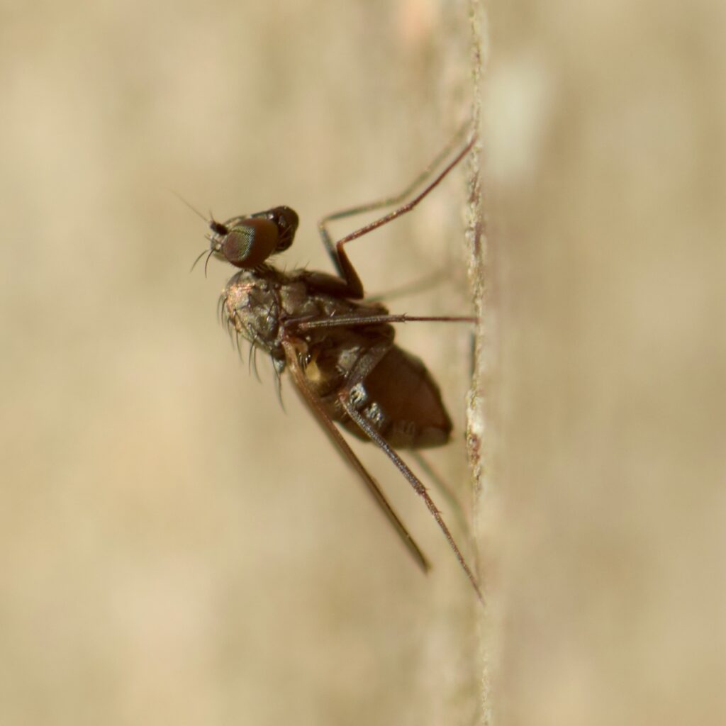 But these flies don’t eat oats. Medetera are predators. As adults they eat an enormous variety of minute creatures, including springtails, flies, and aphids. As larvae, they live under tree bark and eat bark beetle larvae.
